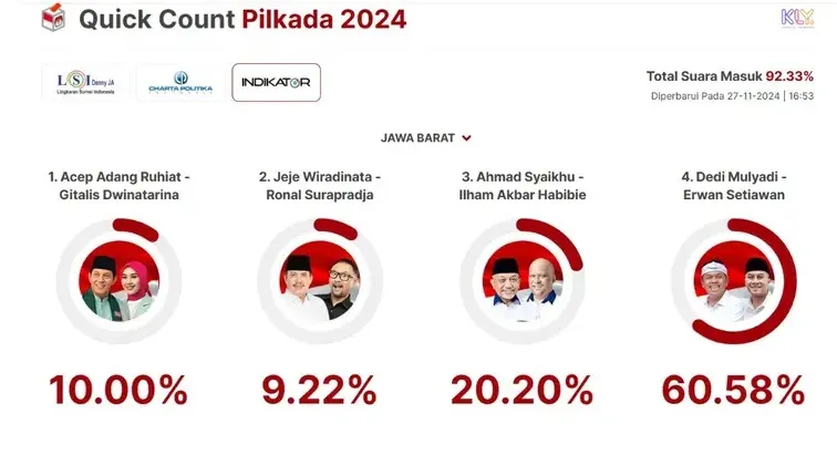 Menurut data terbaru dari Lembaga Survei Indikator Politik, hingga Rabu petang, pasangan Dedi-Erwan mencatatkan angka suara yang mengesankan, yaitu 60,68%. Sementara itu, pasangan Ahmad Syaikhu-Ilham Habibie tertinggal di posisi kedua dengan 20,25%.