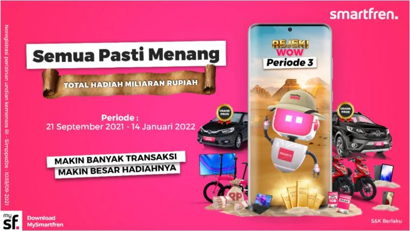 Apalagi cara ikutannya nggak sulit kok. Kamu hanya perlu download atau update aplikasi mySF. Lakukan transaki akumulasi 100 ribu setiap Oasis dan dapatkan hadiahnya langsung, seperti SmartPoin, pulsa, smartphone, tablet, TV, laptop, emas hingga motor. Capai semua oasis dan dapatkan kesempatan memenangkan Grand Prize berupa mobil serta tabungan ratusan juta Rupiah dan emas. Jadi, semakin banyak transaksi semakin besar kesempatan kamu memenangkan Grand Prize-nya.