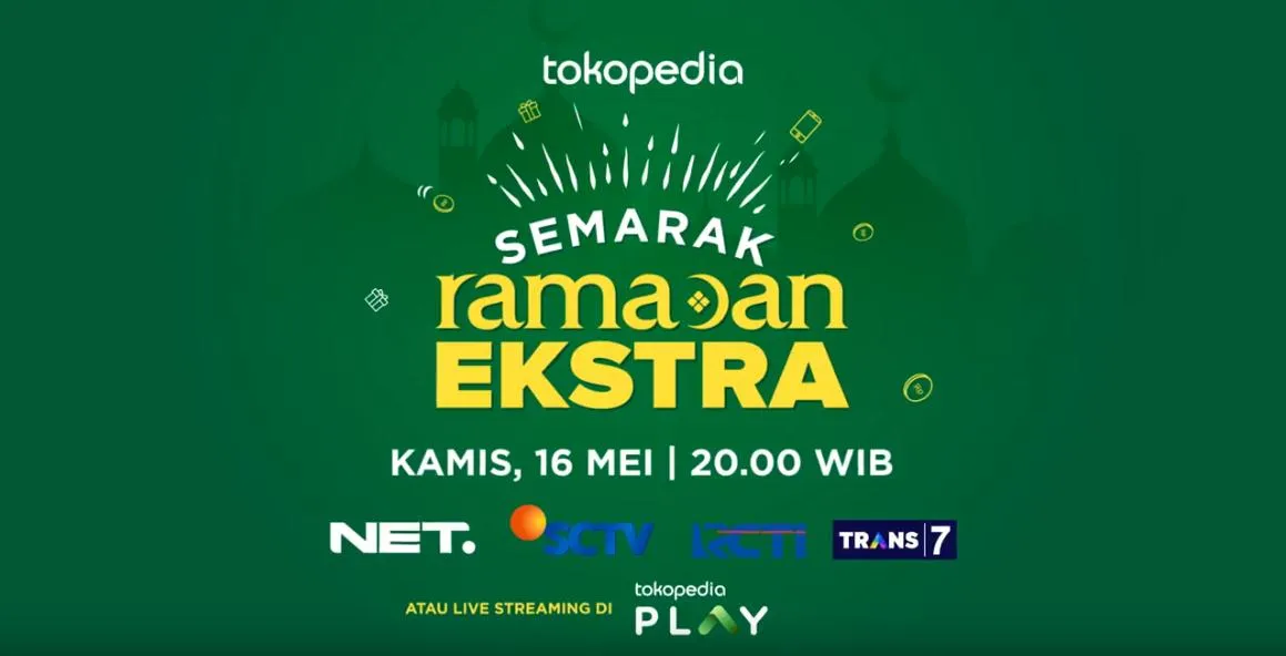 Selain menghadirkan Tradisi Belanja terbesar, Tokopedia juga menggelar acara spesial bernama Semarak Ramadan Extra. Event bertabur diskon dan hadiah ini pun akan disiarkan langsung di NET TV, SCTV, Trans7, RCTI dan juga bisa live stream diaplikasi Tokopedia PLAY pada 16 Mei 2019 pukul 20.00 WIB.