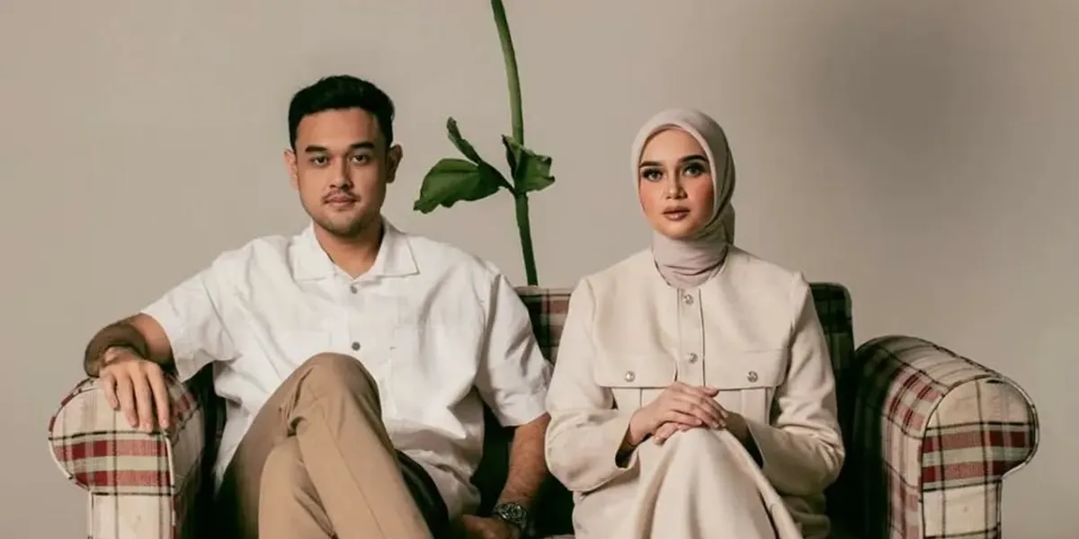 Pasangannya mengenakan kemeja biru muda dengan potongan simpel dan celana broken white yang ringan. Sepatu kulit cokelat melengkapi look kasual-formal yang pas untuk sesi foto studio. Warna soft yang digunakan memberi kesan bersih dan adem.