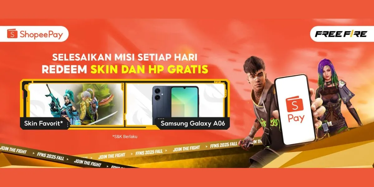 Nah, lewat kolaborasi spesial FFNS 2025 Fall Powered by ShopeePay, kamu bisa menyelesaikan misi harian langsung dari aplikasi ShopeePay untuk kumpulkan poin dan redeem skin FF hingga HP Samsung Galaxy A06 gratis. Semakin rajin klaim, semakin besar kesempatanmu untuk menang di arena pertempuran!