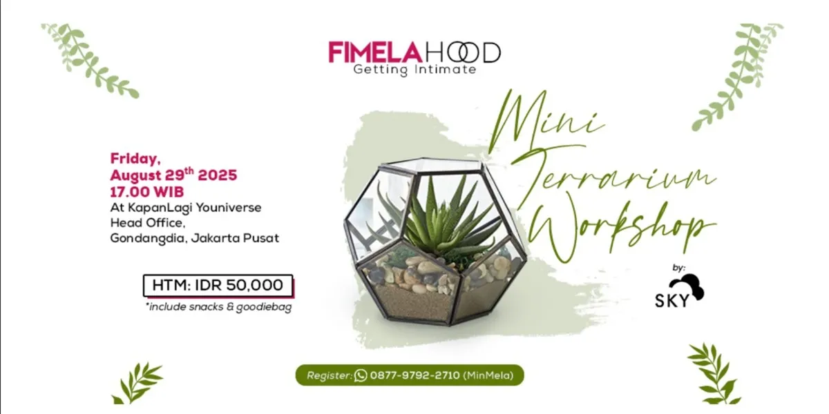 Kapanlagi.com - Fimela.com bersama komunitas Fimelahood kembali menghadirkan aktivitas seru untuk para anggotanya melalui program Fimelahood Getting Intimate. Kali ini, aktivitas yang diangkat adalah Mini Terrarium Workshop yang akan berlangsung pada Jumat, 29 Agustus 2025 pukul 17.00 WIB di KapanLagi Youniverse Head Office, Jakarta Pusat.