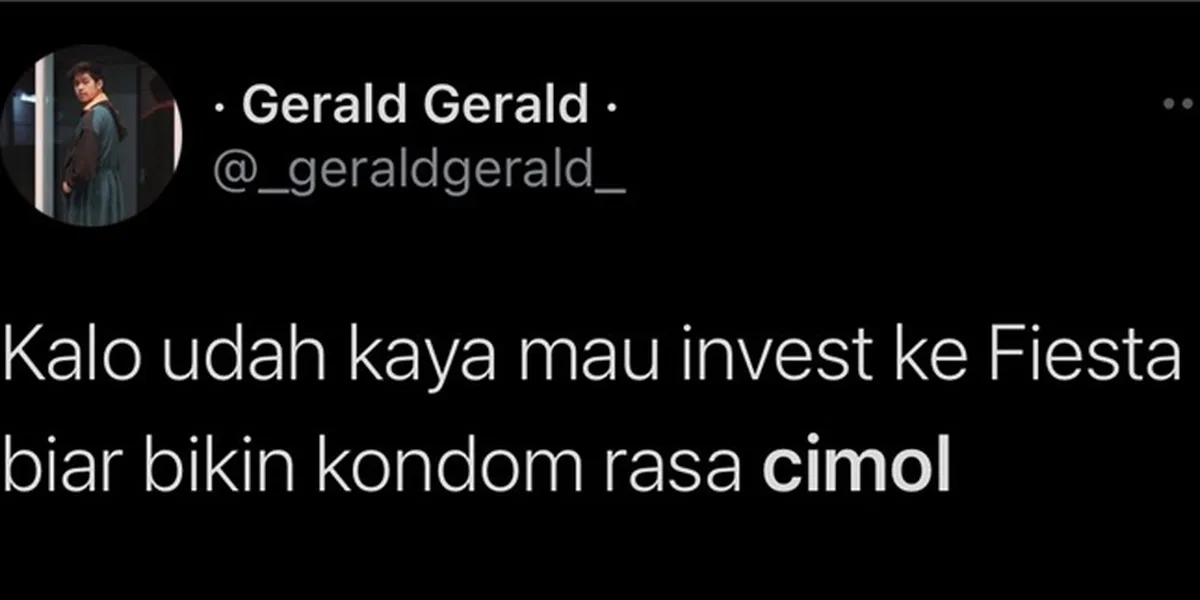 "Karena dari kemarin banyak yang request rasa seblak jeletot, maka kita kasih ke kalian, Fiesta Rasa SPICY CIMOL!! Beli cimol sekarang bakal jadi beda! Level 15, yok diorder yok!" tulis merk kondom Fiesta di akun Twitter resminya.