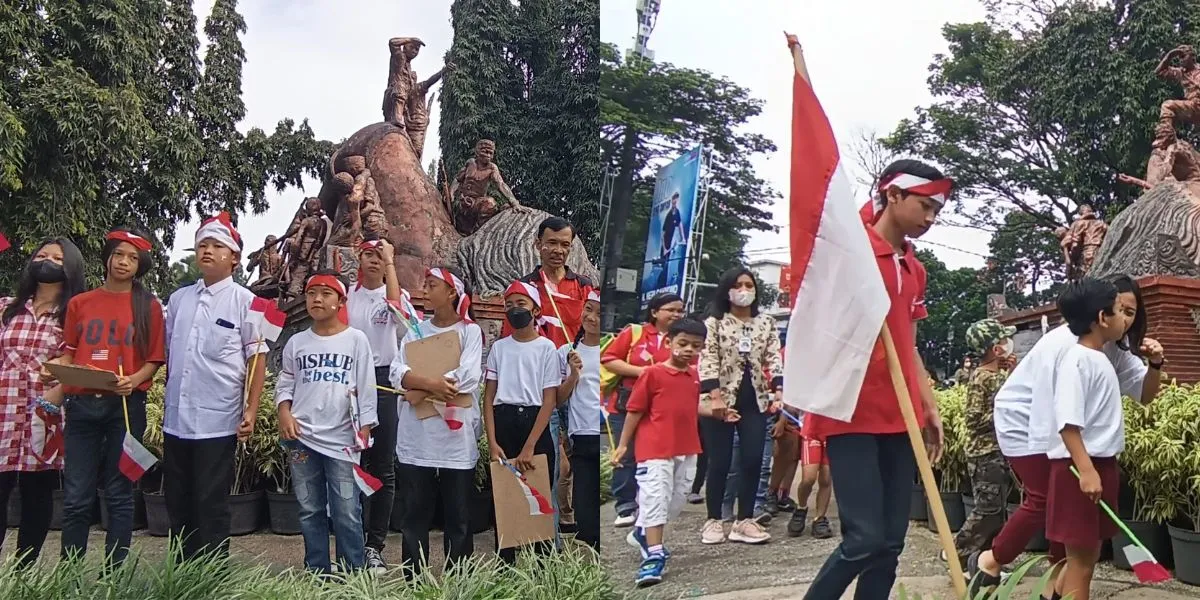 Kapanlagi.com - Otniel Alexy Effrandito (12) membawa bendera merah putih memimpin rombongan menuju Monumen Juang 45. Siswa Kelas 6 SD Shining Star itu bersama rombongan bergerak usai menyaksikan monumen bersejarah, Tugu Kemerdekaan dari Gedung DPRD Kota Malang.