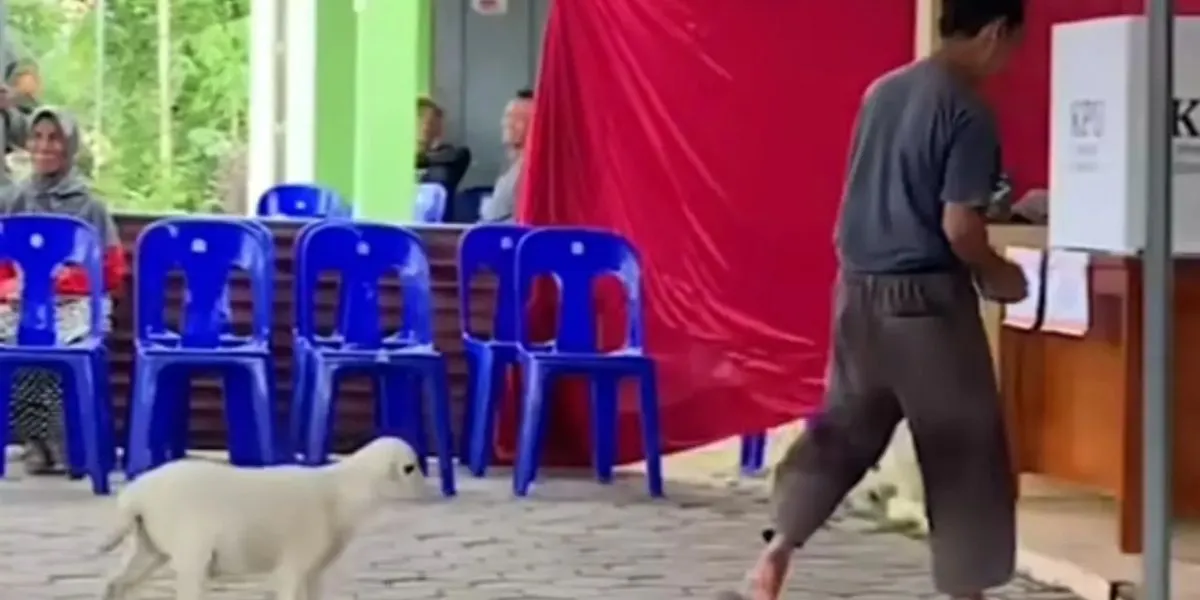 Dalam sebuah video yang menghibur, seorang pria terlihat dengan santai melangkah menuju tempat pemungutan suara (TPS) diikuti oleh kambing kesayangannya yang tampak sangat ceria.