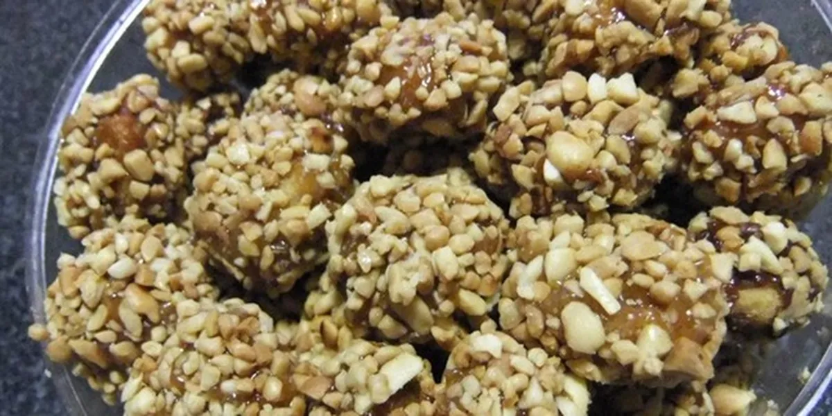 - Celupkan kue kering ke dalam lapisan karamel, lalu gulingkan ke taburan kacang tanah.