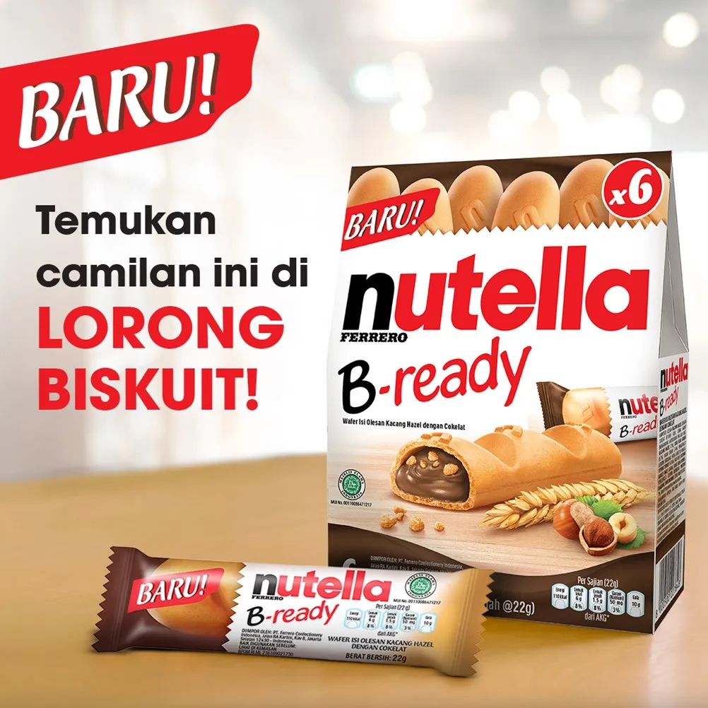 Nutella B-ready sendiri dibuat dari kombinasi unik wafer renyah dengan isian krim Nutella yang lembut dan ditaburi dengan krispi gandum. Hanya Nutella B-ready yang mengombinasikan Nutella yang orisinal dan nikmat dalam wafer yang lezat dan renyah, serta praktis dan mudah dimakan di mana pun.