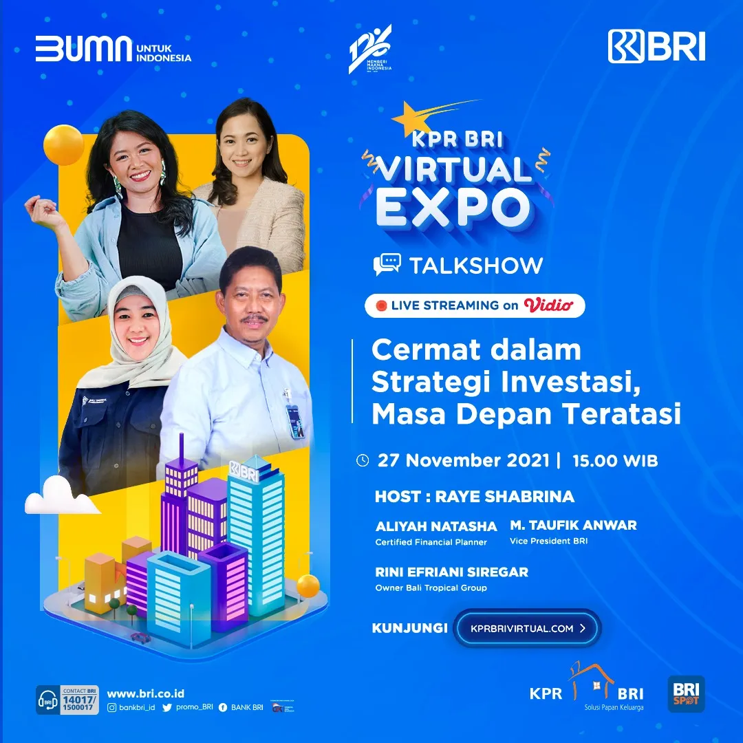 Nah, di talkshow selanjutnya nanti KPR BRI Virtual Expo akan menghadirkan topik spesial ‘Cermat dalam Strategi Investasi, Masa Depan Teratasi’. Talkshow ini akan dipandu oleh Raye Shabrina serta akan menggandeng sederet narasumber berkompeten. Mulai Aliyah Natasha selaku Certified Financial Planner. Kemudian, ada M. Taufik Anwar selaku Vice President BRI, serta Rini Efriani Siregar selaku owner Bali Tropical Group.
