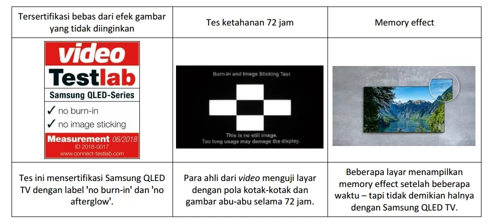 Kabar gembiranya, Samsung QLED TV menjadi TV pertama yang memperoleh sertifikat bebas 'Burn-In' oleh Video, sebuah majalah teknologi Jerman yang terkenal. Evaluasi dilakukan secara menyeluruh oleh majalah ini tentang kerentanan terhadap 'Burn-In' dan afterglow. Hasilnya membuktikan kalau TV Samsung bebas dari keduanya, dan menunjukkan apa yang membuat QLED TV menjadi televisi paling tahan lama di pasar saat ini. Tentu saja ini jadi cara eksplorasi Samsung untuk membantu konsumen mendapatkan lebih banyak manfaat dari televisi dan dipakai untuk waktu yang lebih lama.