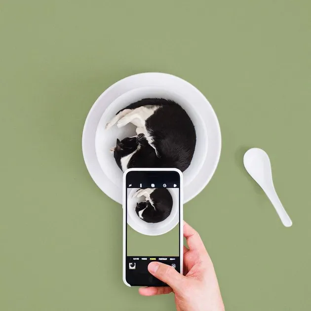 Hugo memilih background warna solid nan cerah untuk mengabadikan kelucuan kucingnya. Tak hanya foto yang artsy, Hugo juga menambah caption jenaka seperti misalnya 'Resolusi tahun baru: menaklukan dunia dan lebih banyak tidur siang'.