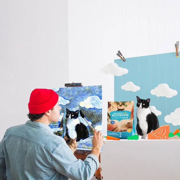 Kini kucing gemas ini juga menerima endorse loh! Lihat saja ia berpose dalam kanvas bersama salah satu merk makanan kucing.