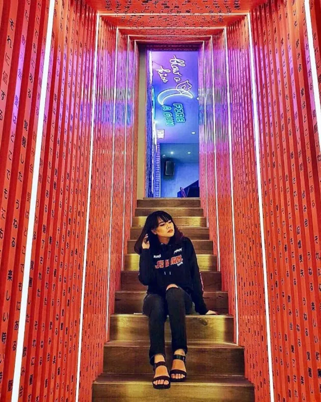 Bergaya di tangga ia pun masih telicat cantik dan anggun.