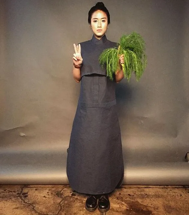 Menggunakan baju terusan panjang. Ia pun juga masih terlihat cantik.