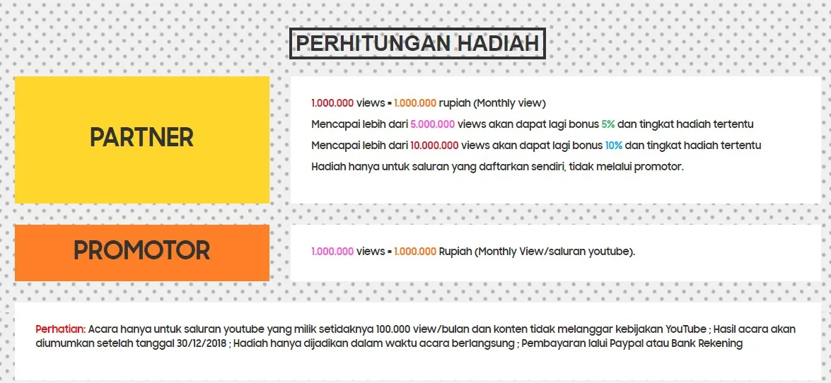 Ada beberapa syarat agar kamu bisa bergabung dalam jaringan besar yang dimiliki Yeah1 Network. Kamu harus punya Youtube Channel dengan jumlah views lebih dari 100 ribu per bulannya. Selain itu, isi konten yang dibuat nggak melanggar kebijakan monetisasi Youtube. Jika melakukan pendaftaran di website Yeah1 Network, kamu akan diperkenalkan oleh orang lain di bulan Desember sekaligus mendapatkan hal-hal yang terkait kebijakan tersebut.