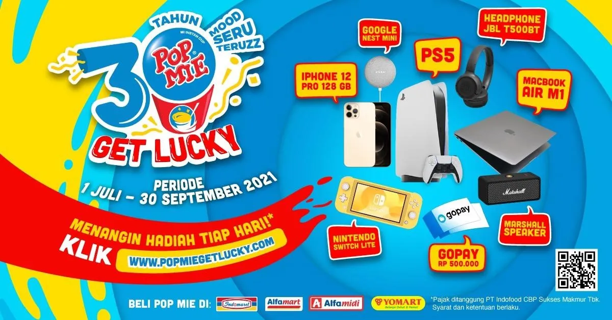 Nah, buat Grand Prize yang bikin mupeng, menghadirkan hadiah-hadiah fantastis dan menggiurkan, seperti iPhone 12 Pro 128GB, Macbook Air M1, dan PS5. Nantinya, pemenang Grand Prize Pop Mie Get Lucky ini akan diumumkan pada saat Big Bang Event 30th Anniversary Pop Mie di stasiun TV pada bulan Oktober 2021.