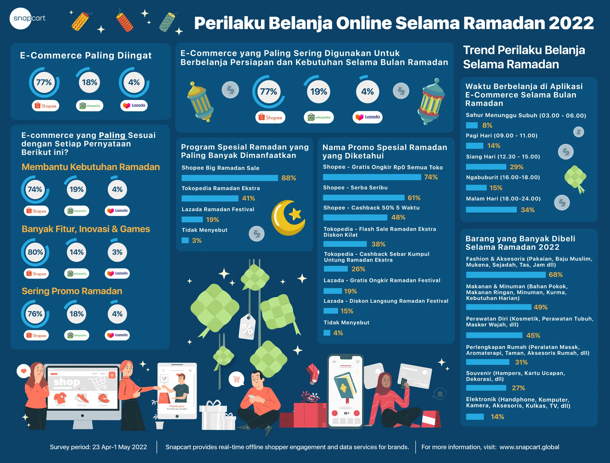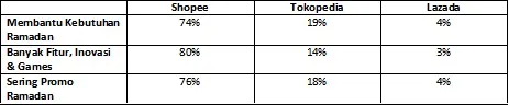 Data-data di atas menunjukkan bahwa Shopee menjadi unggulan selama Ramadan, di mana terlihat melalui survei bahwa 77% responden memilih Shopee sebagai e-commerce yang paling sering digunakan untuk berbelanja persiapan dan kebutuhan selama bulan Ramadan. Hasil ini diikuti Tokopedia (19%) dan Lazada (4%).