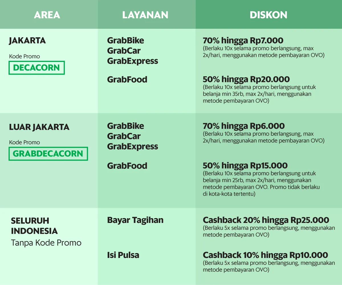 Sebagai ucapan terima kasih Grab memberikan Diskon #LEVELDECACORN hingga 70% untuk semua layanan Grab. Berlaku di seluruh Indonesia dari 28 Februari – 14 Maret 2019 selama promo tersedia setiap harinya.
