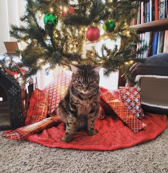 Biasanya kucing bakal happy saat mendapat hadiah. Tapi ekspresi Giggles The Angry Cats ini menunjukkan perasaan sebal, mungkin karena diminta berbagi hadiah atau kado yang didapat tak sesuai dengan keinginannya.